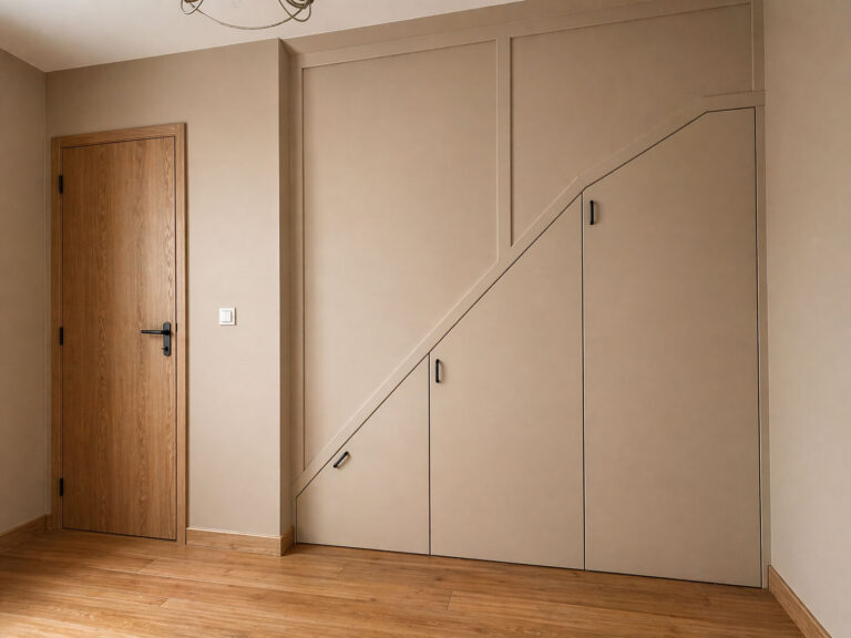 Pour optimiser chaque recoin sous les rampants, nous créons des placards sur mesure qui s’adaptent à la géométrie de vos combles et à vos besoins de rangement.